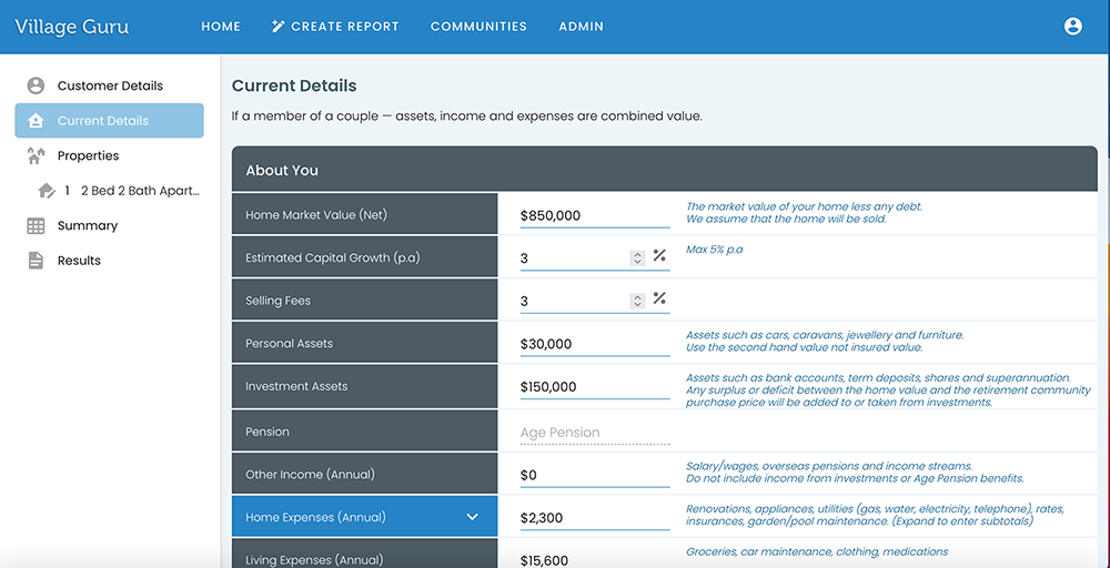 At the heart of Village Guru is the Village Essentials Report which provides downsizers with the information they need to understand and compare the costs of moving to a village, including: