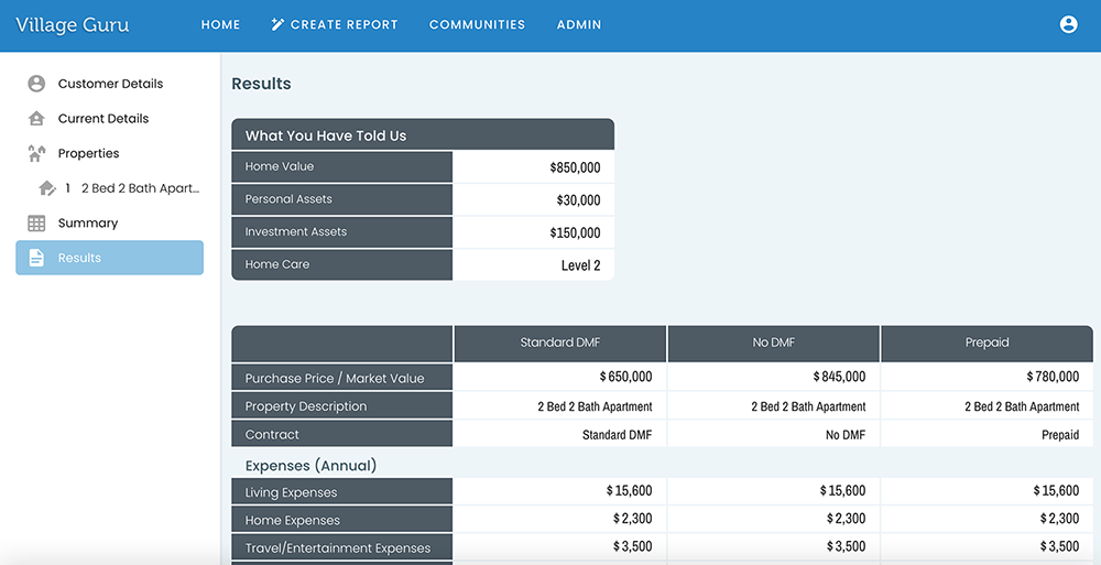 The software provides the flexibility to compare different payment options within a village, compare one village to another, and compare the costs of downsizing to the village with staying in their current home.